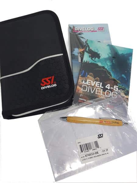 Hoge kwaliteit map met SSI logo, logboekvullingen voor de eerste 100 duiken, mapje voor brevetkaarten en een pen. Alles wat je nodig hebt om met je SSI duikavontuur te starten.